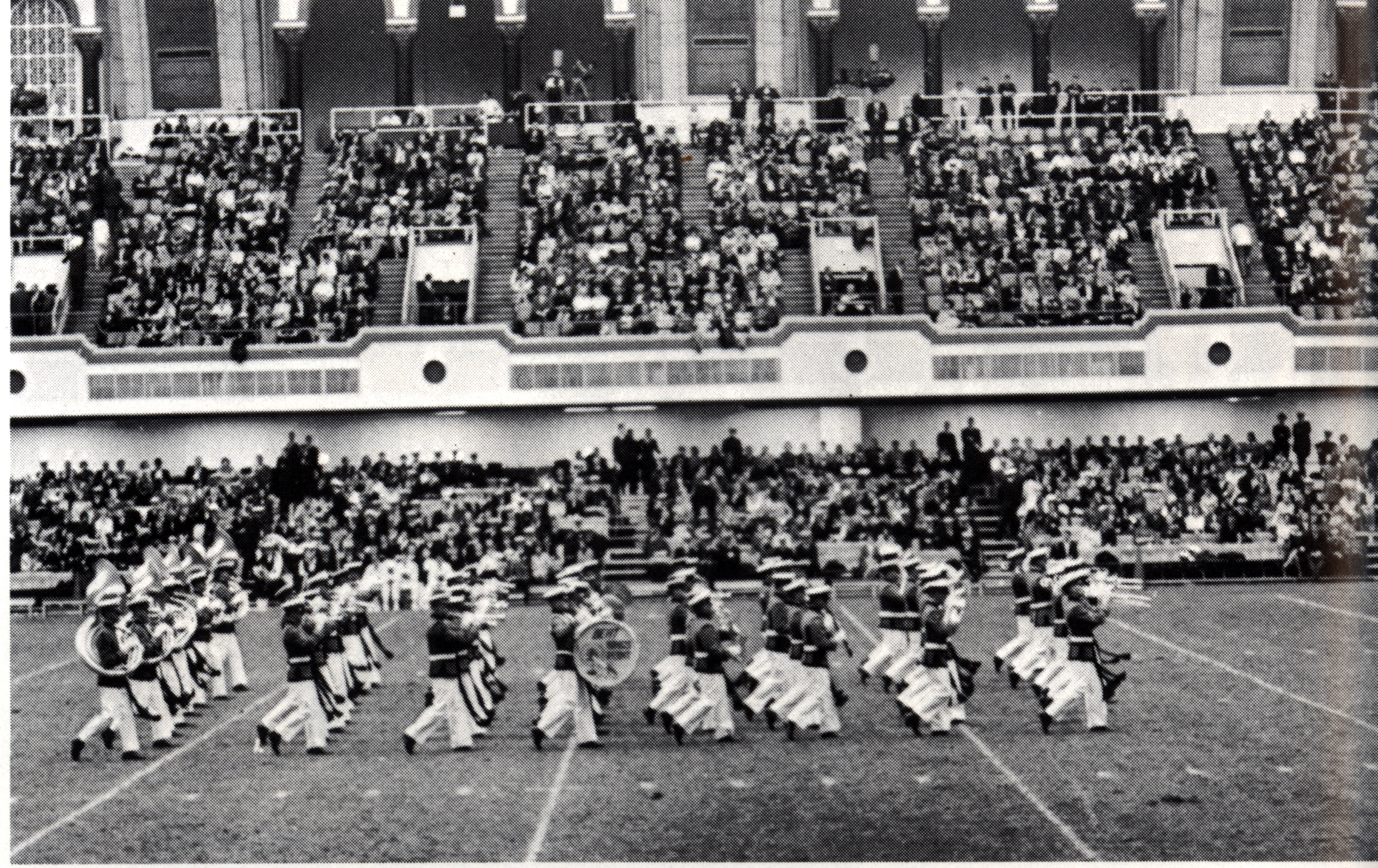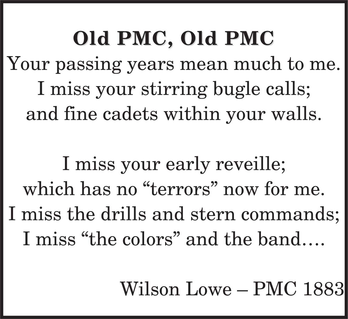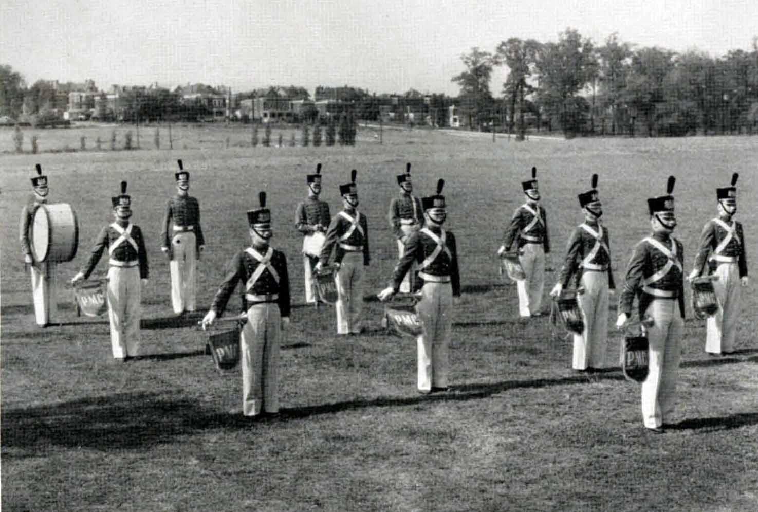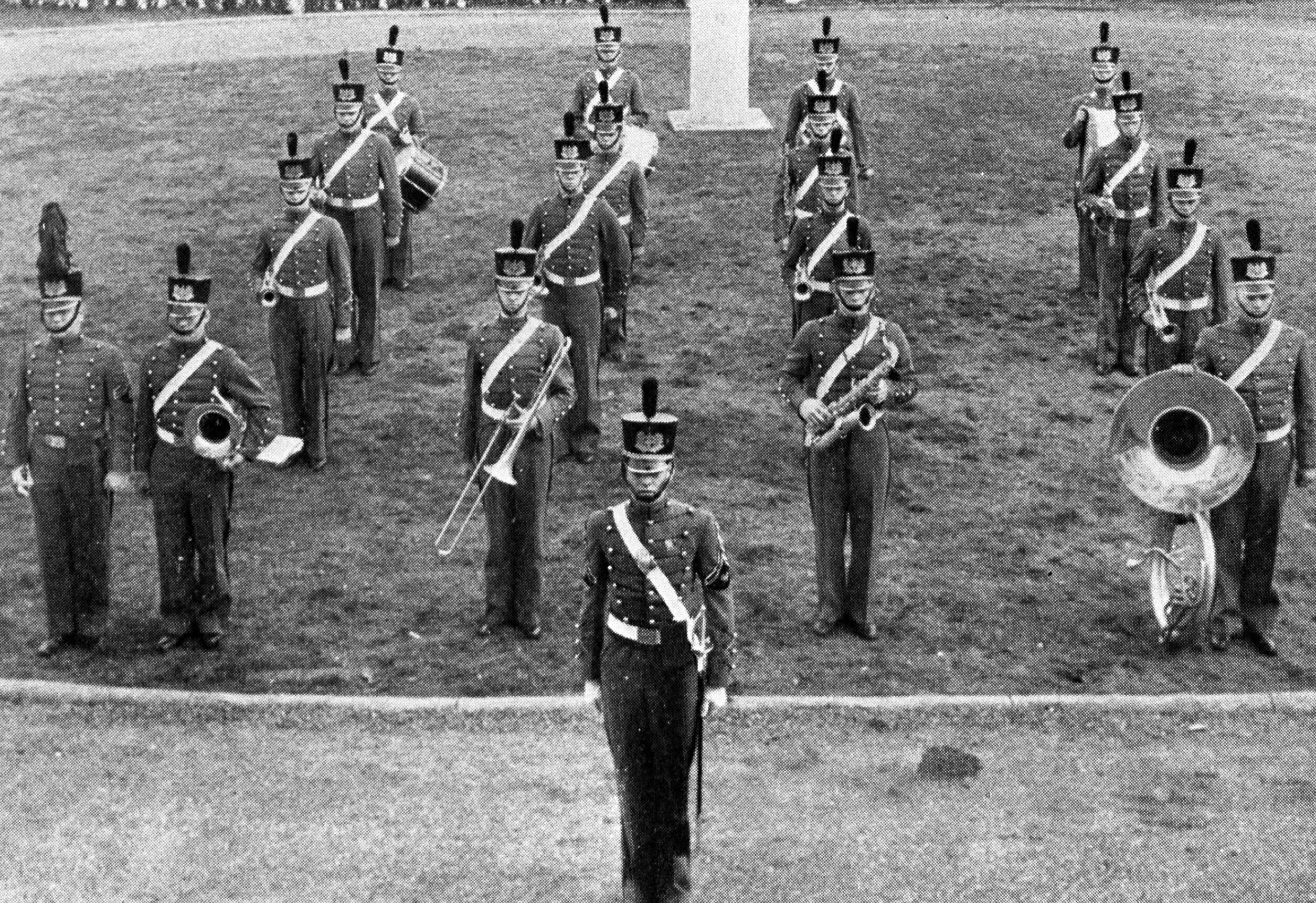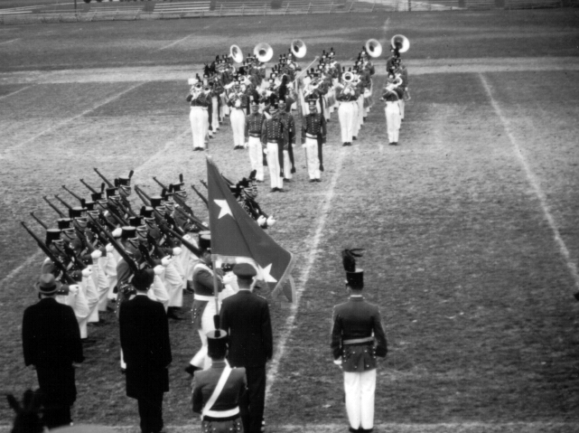 In the 1903 yearbook, the PMC Band is listed as a musical organization with twenty members under the direction of E.W. Hyatt. In 1935, Professor/Major John Norris Robinson ’84, starting with fourteen cadet musicians, launched the modern day PMC Marching Band that played at formations, honor guards and parades. Robinson had previously directed the 198th Coast Artillery Band. World War II temporarily reduced its ranks but drums and bugles remained on campus. After the war, the Band soon grew strong again and was even appearing on local area radio and TV programs in the late ‘40s and ‘50’s.
